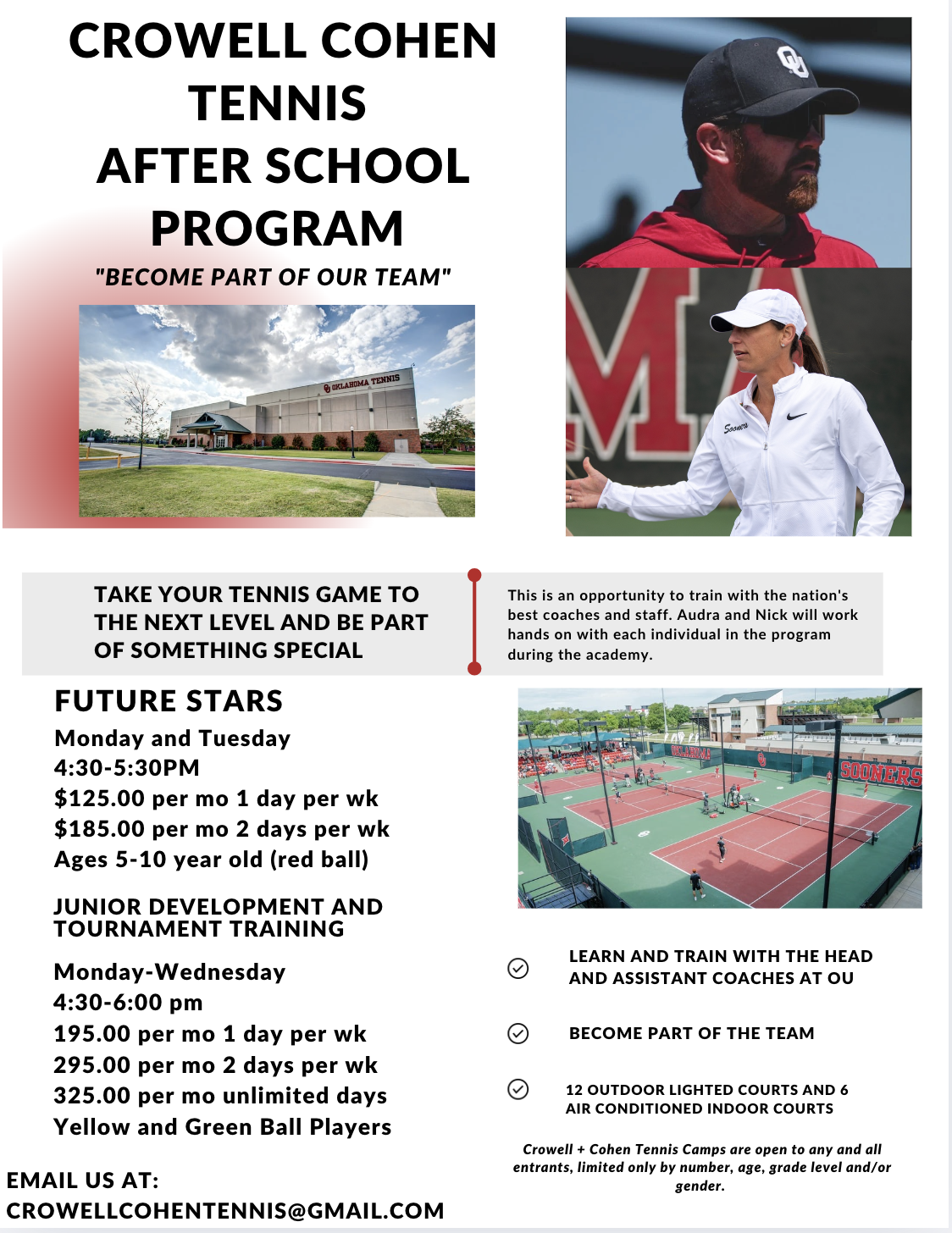 Learn from the Nation’s premier coaches and experience tennis in a fun and healthy environment that is exciting for all levels. Whether you are just getting started in tennis, a rising tournament player, or even an elite level tournament player, we have the right program for you. The OU Head Men’s and Women’s Tennis Coaches, Nick Crowell and Audra Cohen, have a system and philosophy designed to enable every player a chance to reach their full potential. In addition, all classes are held at the Headington Family Tennis Center, one of the Nation’s finest tennis facilities, at the University of Oklahoma. The OU Tennis Club features 12 outdoor and 6 indoor courts. Classes are held daily during the school year and we also offer overnight and day camp options during the summer.